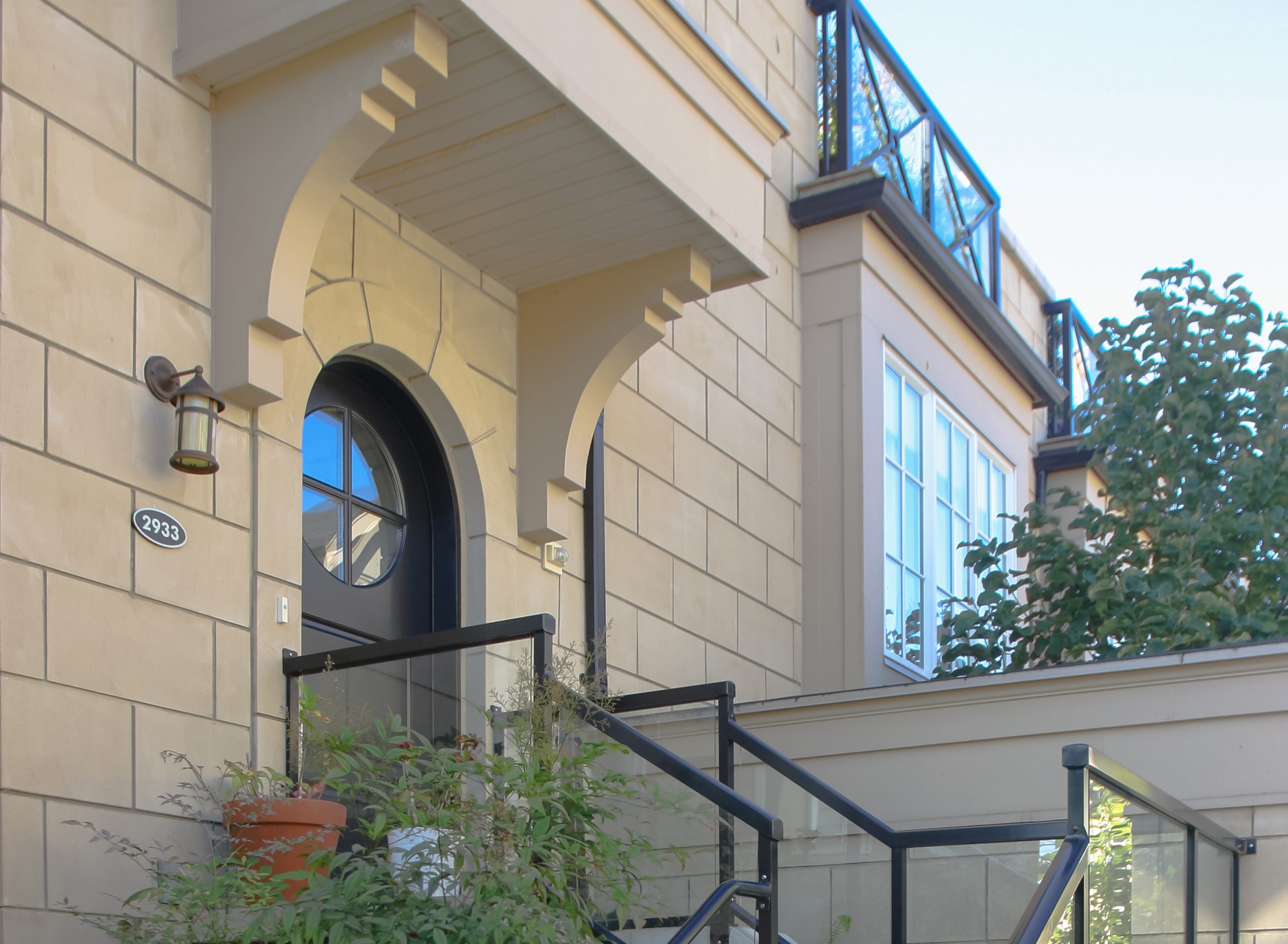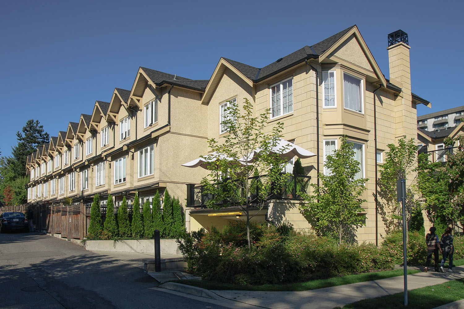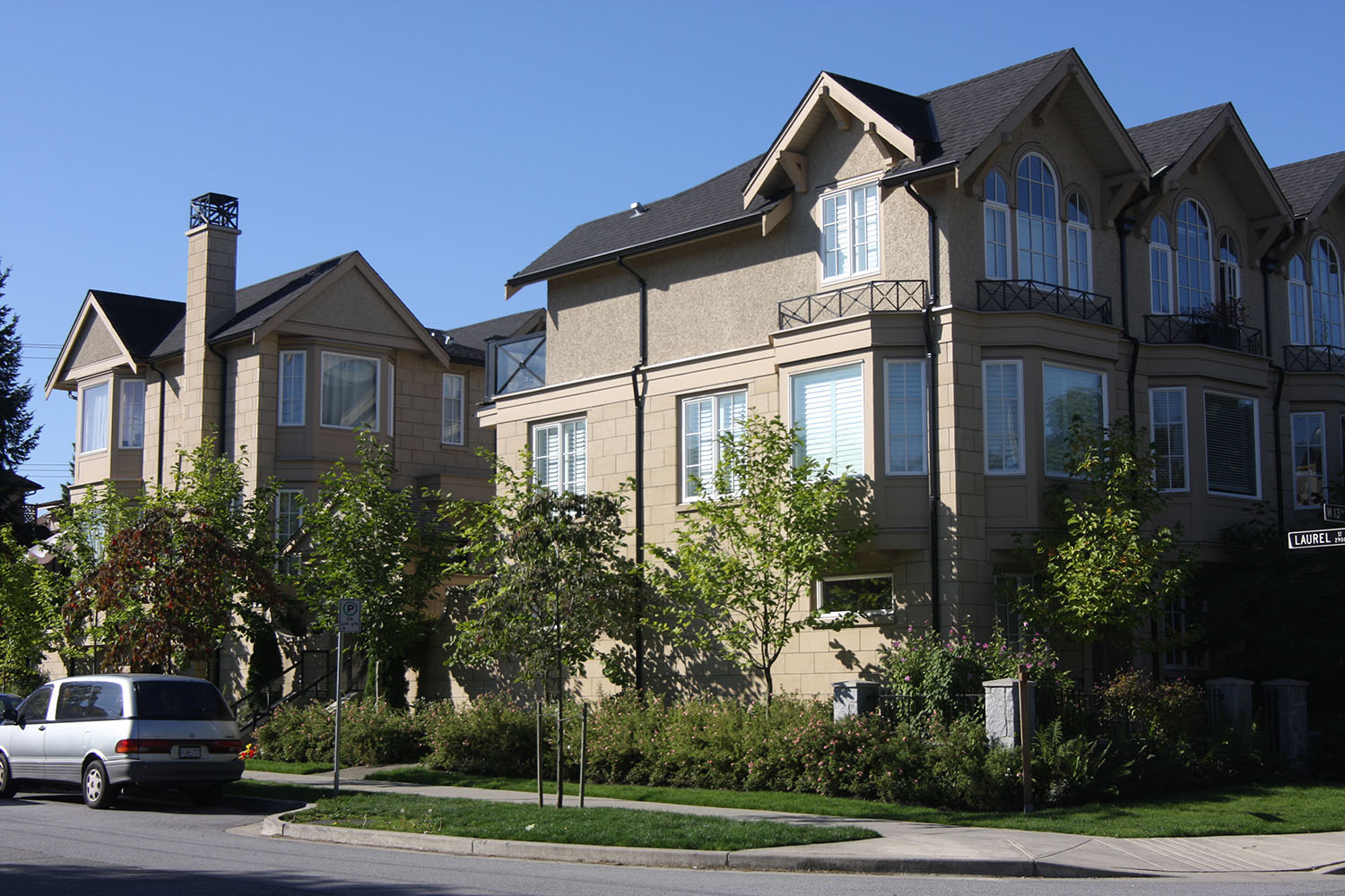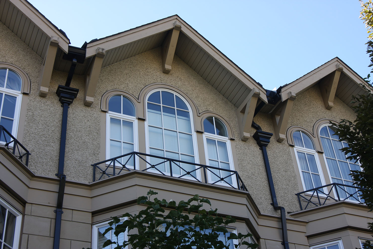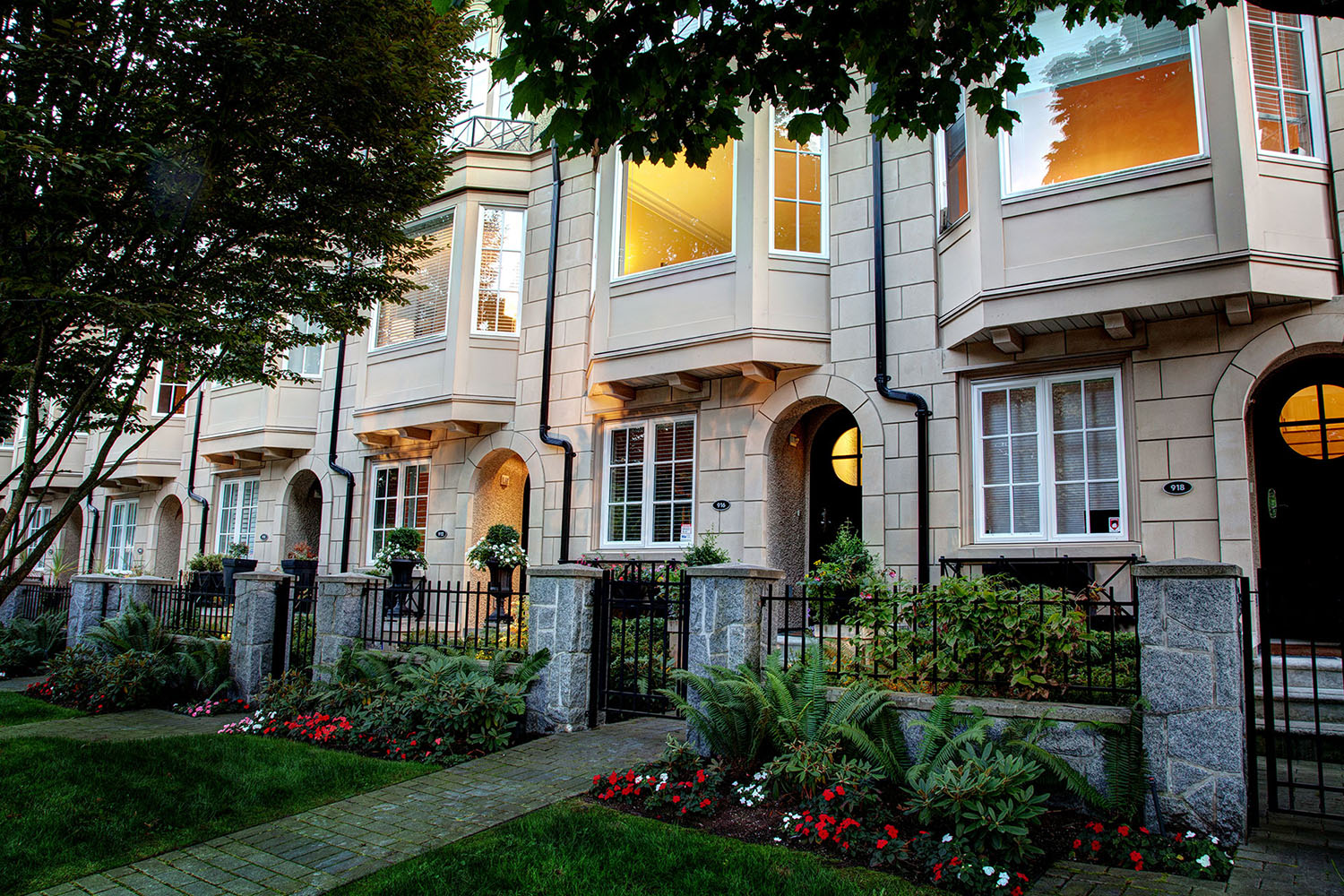 This collection of 24 townhomes in Fairview was designed to look like they were always there. The transition from stone to stucco of the siding, roof details like a catslide roof and a steep pitch, arched muntin windows, and ornamental chimney caps are just some of the many unique elements of Brownstone Townhomes found elsewhere in North America