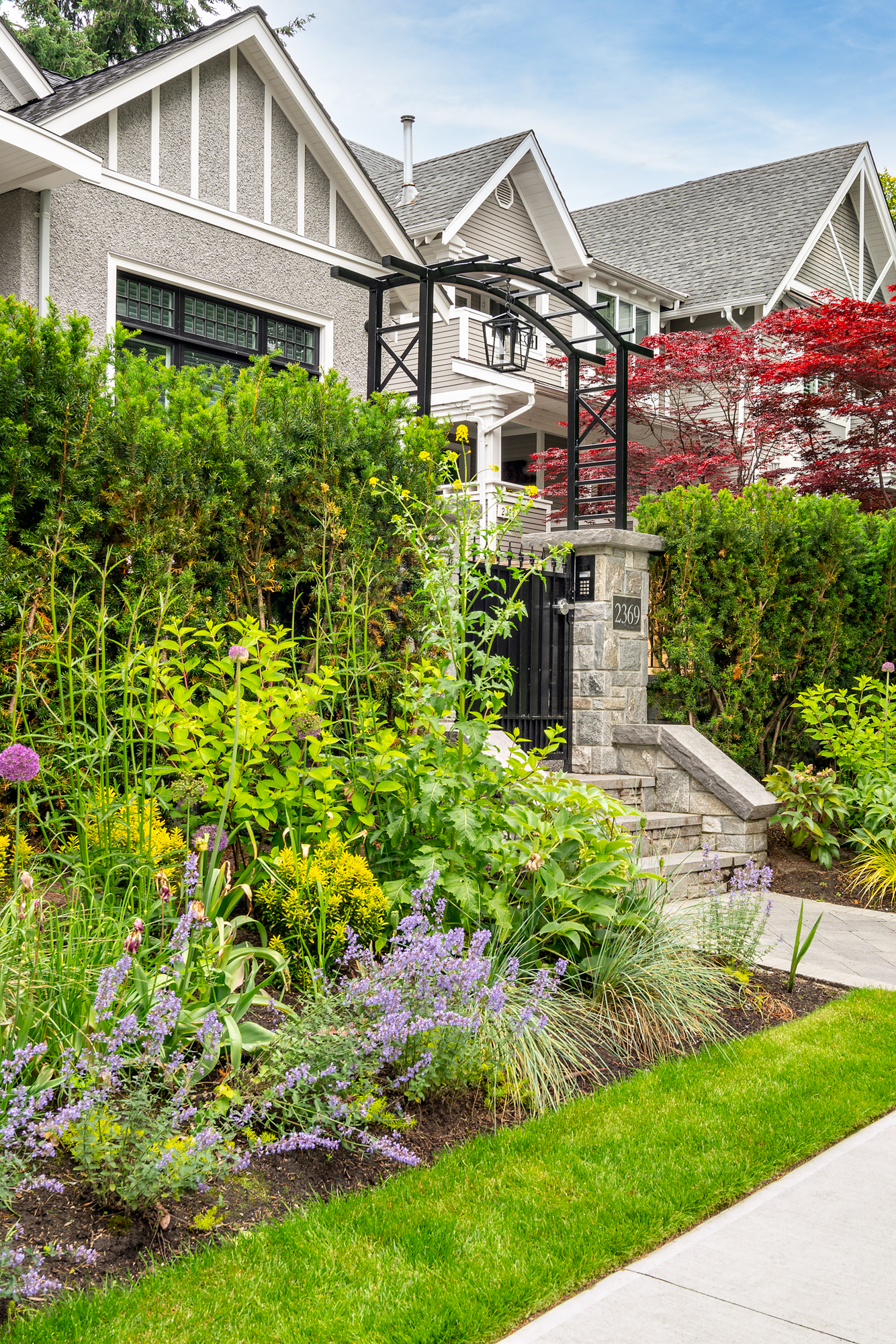 For this Kitsilano residence a strong landscape definition at the front property line and in the back lane was achieved through an evergreen dark yew hedge, enveloping the pedestrian and driveway gate. The metal gates with solid panels match the arched metal arbor, picking up on architectural detail on the house.
