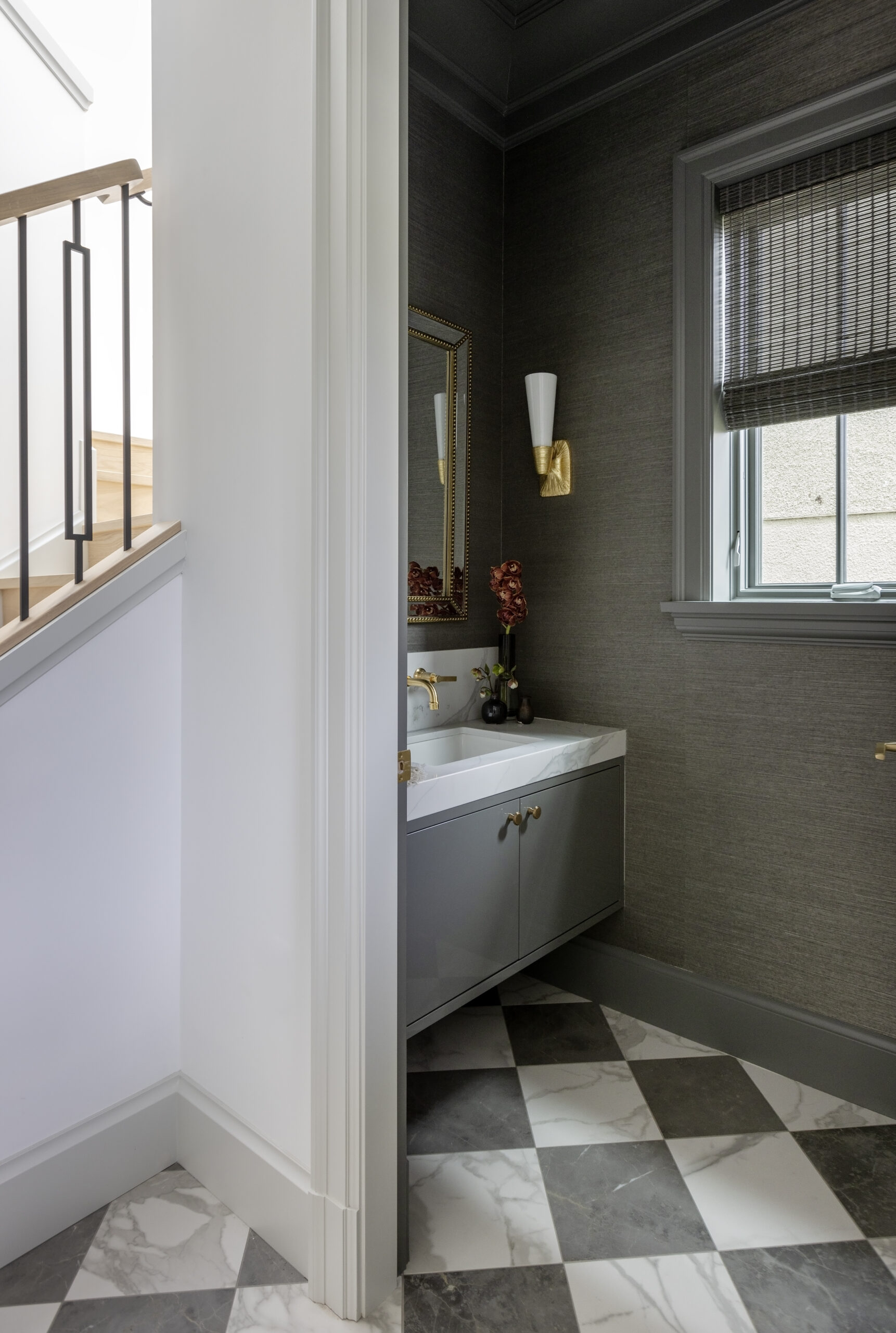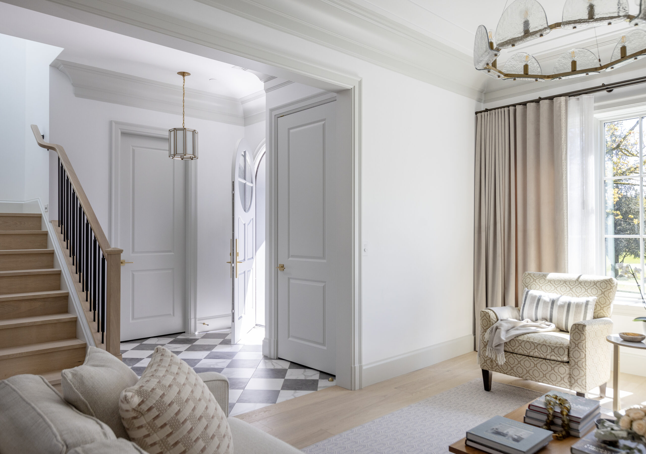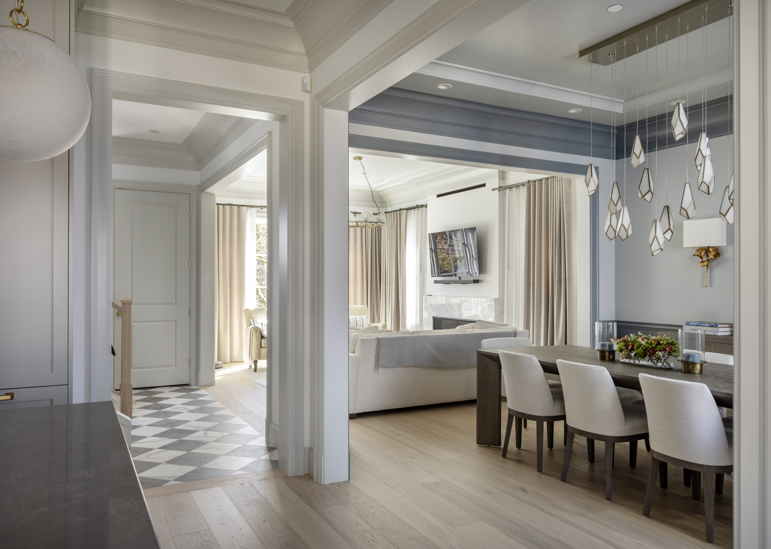 Saturating some rooms in one tonal scheme allowed for dramatic moments in the home, while the checkerboard flooring in the entry hall brings a vivid pop against the softness of the open plan main floor.