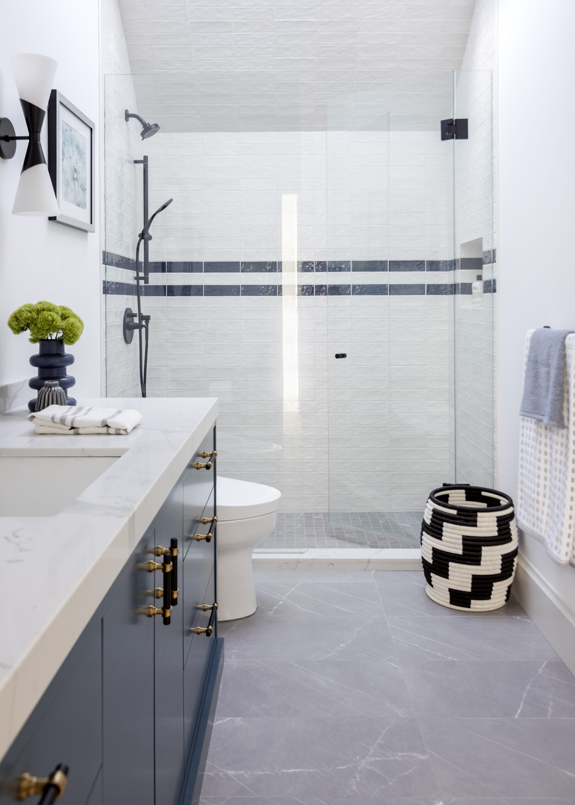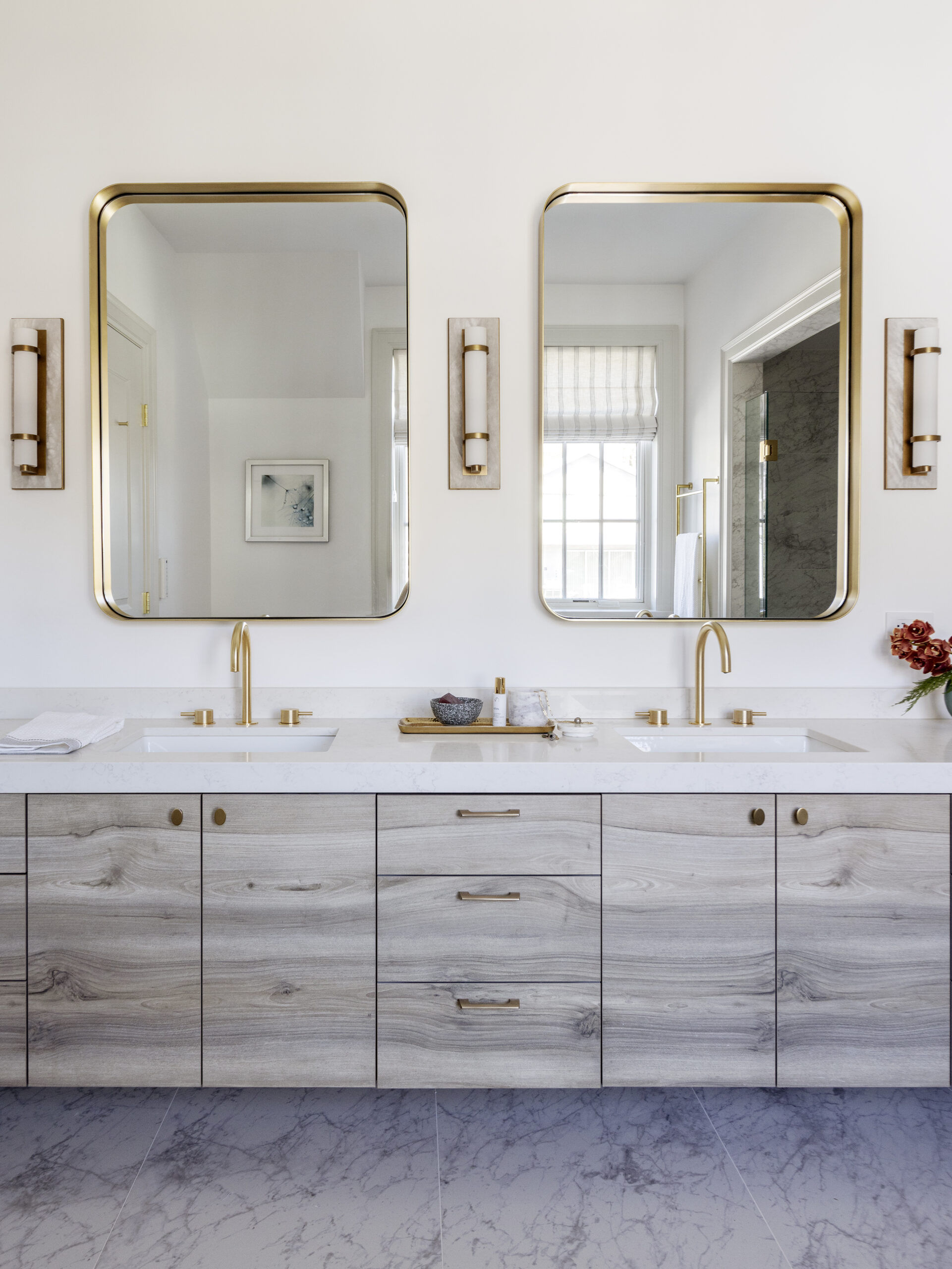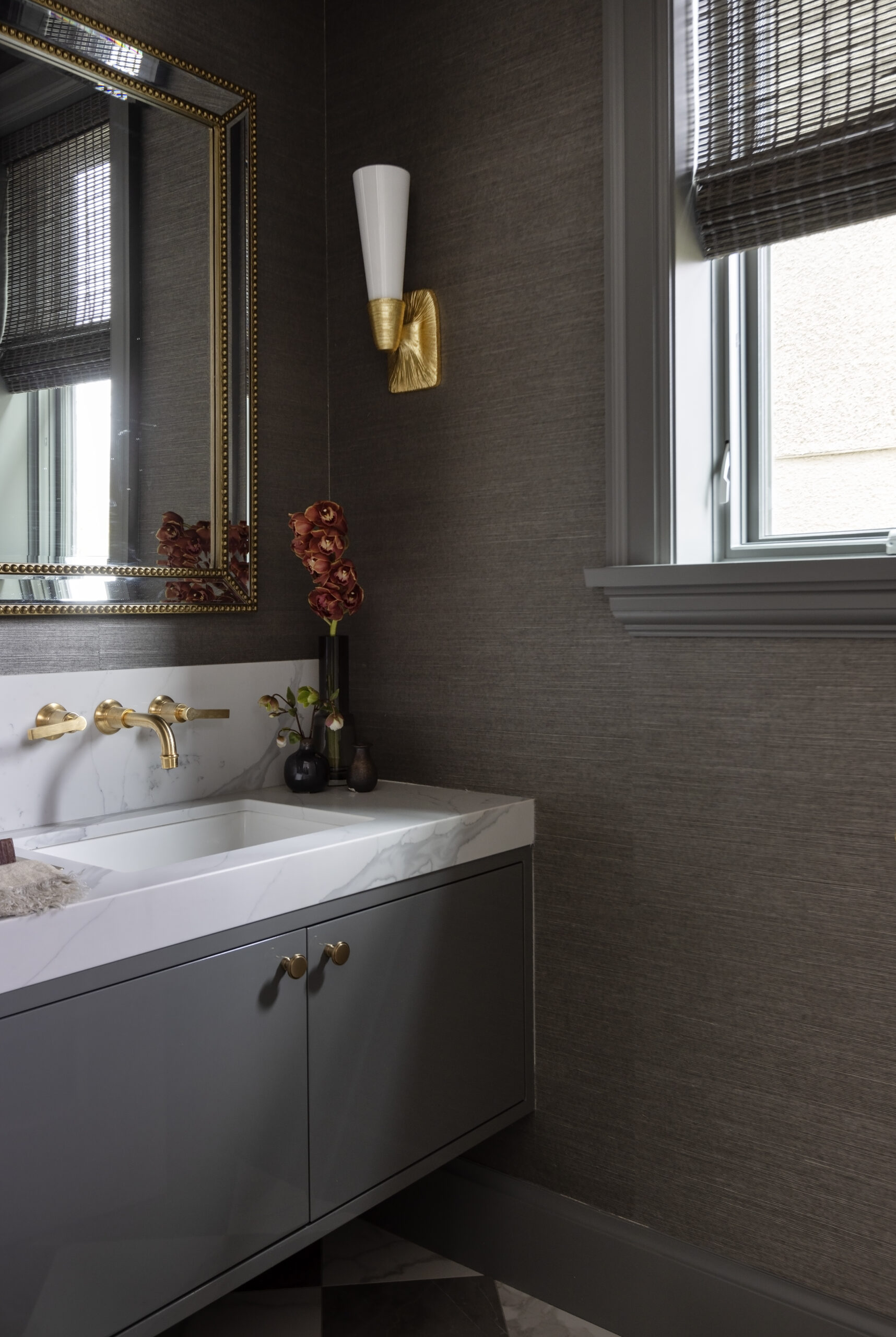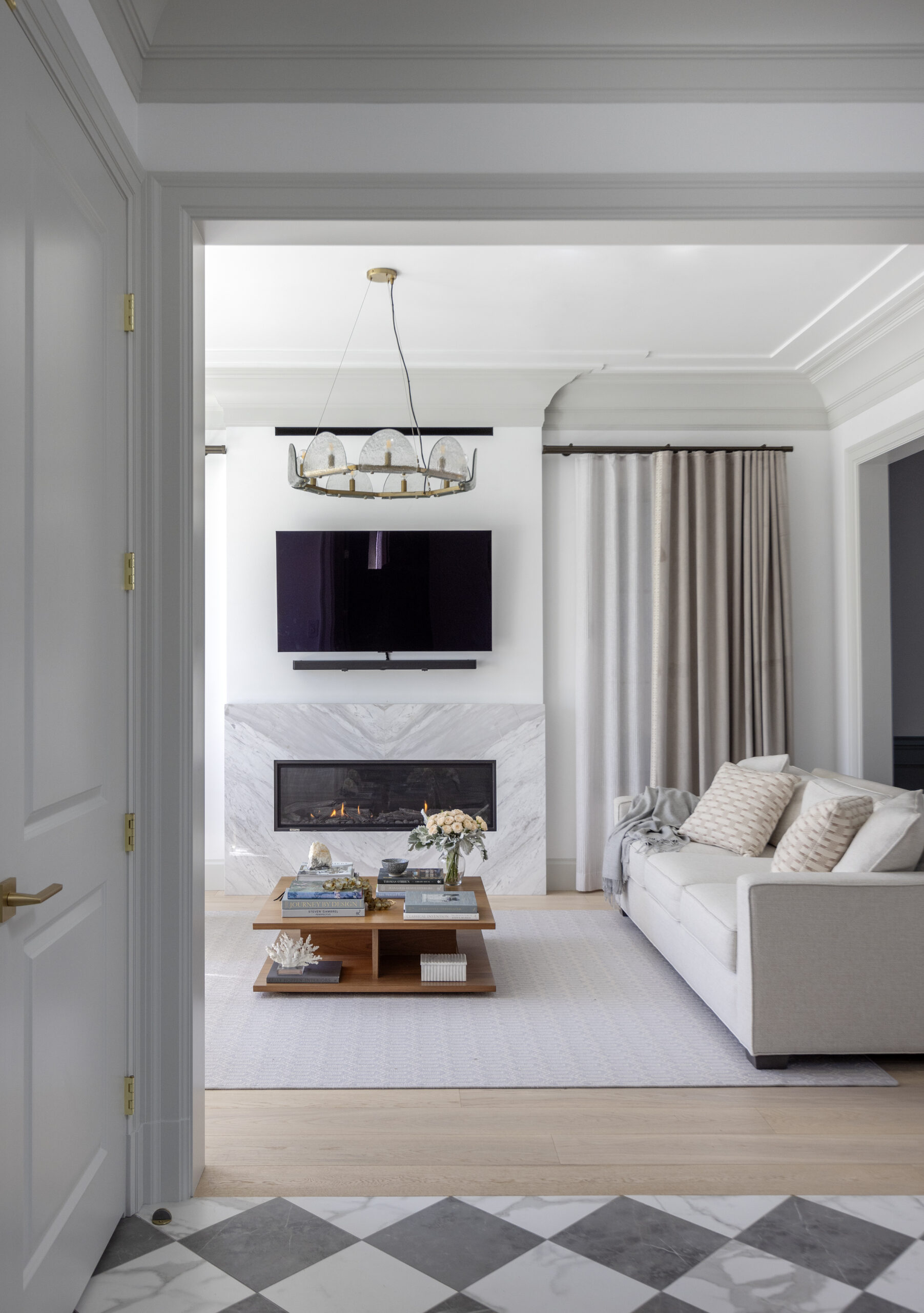 Saturating some rooms in one tonal scheme allowed for dramatic moments in the home, while the checkerboard flooring in the entry hall brings a vivid pop against the softness of the open plan main floor.