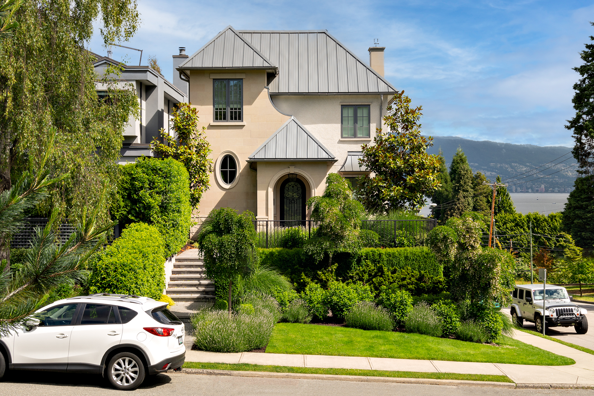 This urban villa in the heart of Point Grey features limestone detailing, arched window expressions, and sharp metal rooflines. The roof deck offers unimpeded views of English Bay and the North shore, while the restrained front entrance lends a welcoming embrace to the established Point Grey streetscape.