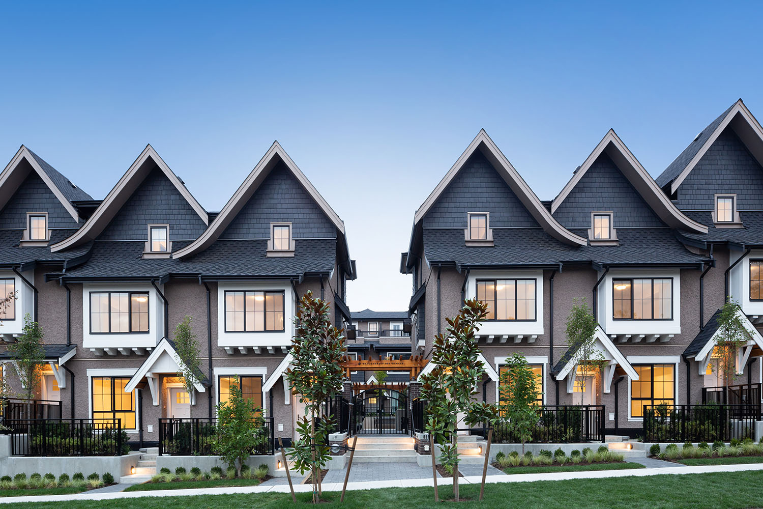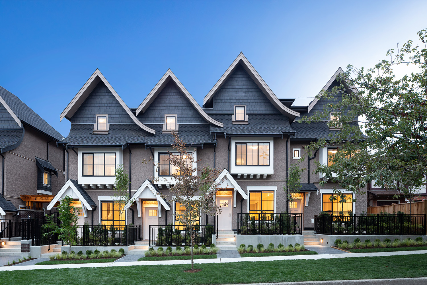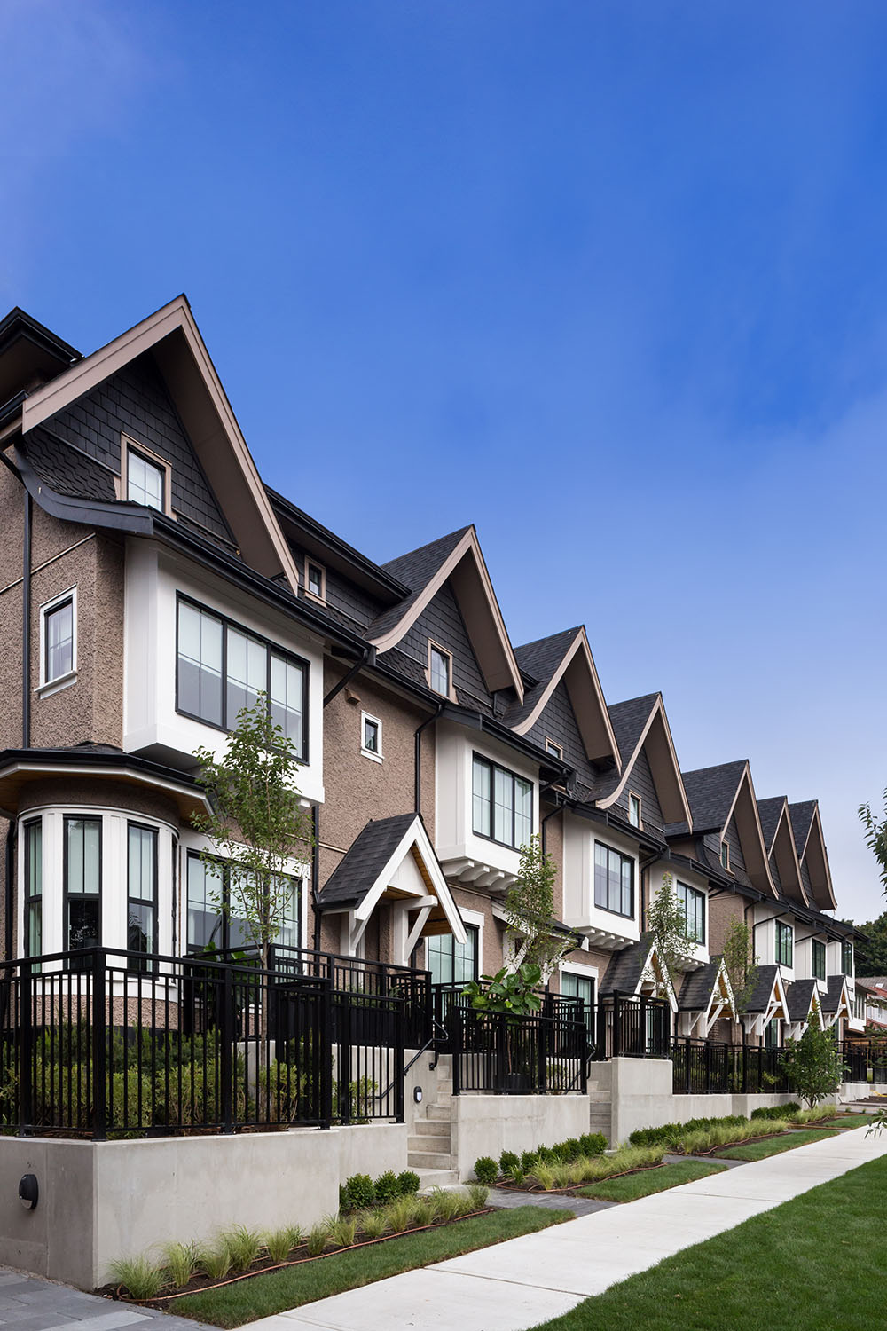 Formwerks adopted a contemporary traditional design with a catslide roofline and a steep pitch for this collection of 15 townhomes located in Marpole. The intricate wood detailing, decorative knee brackets and dentils bring an irreverent single-family charm to multi-family homes in a neighbourhood.