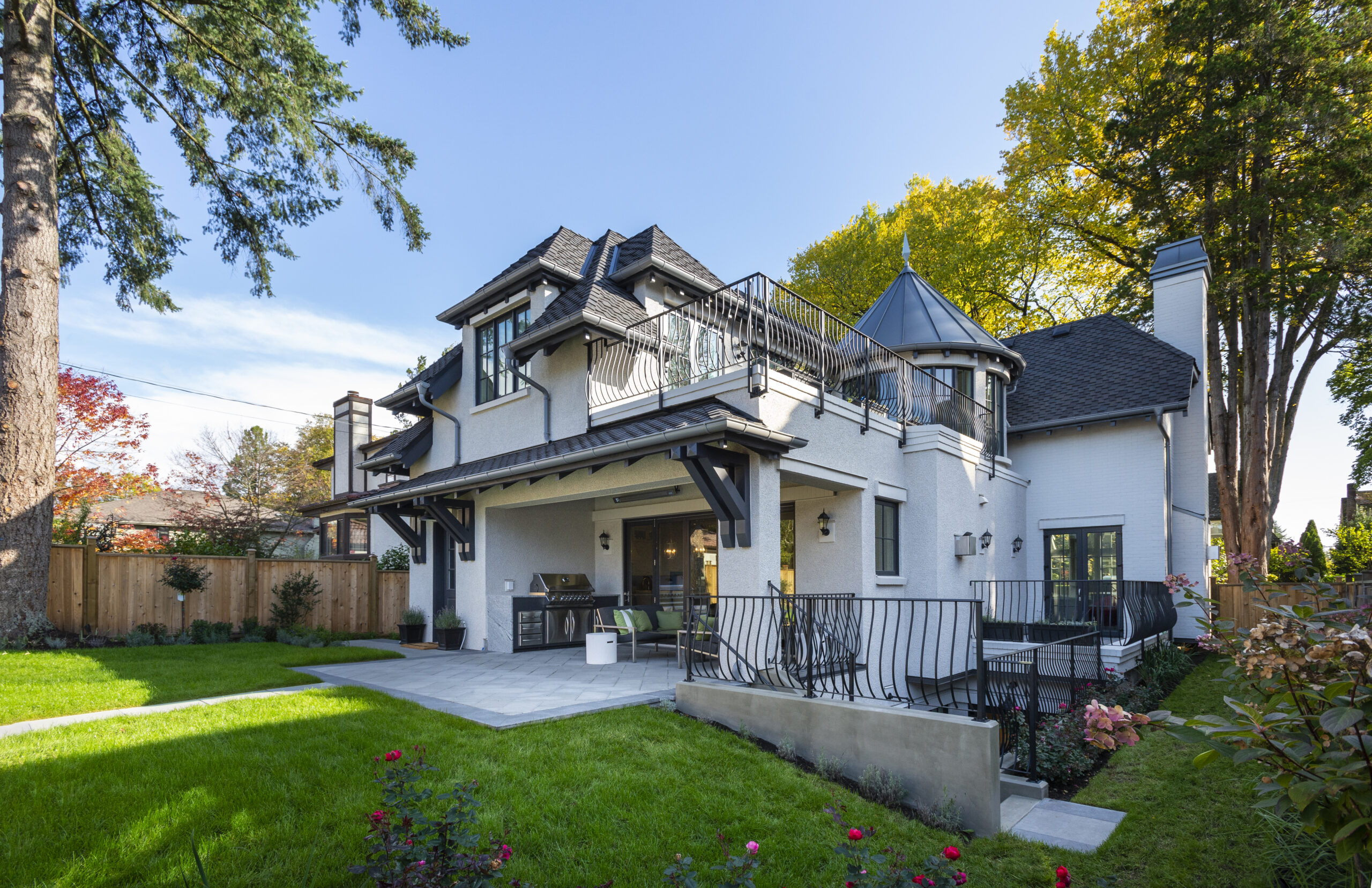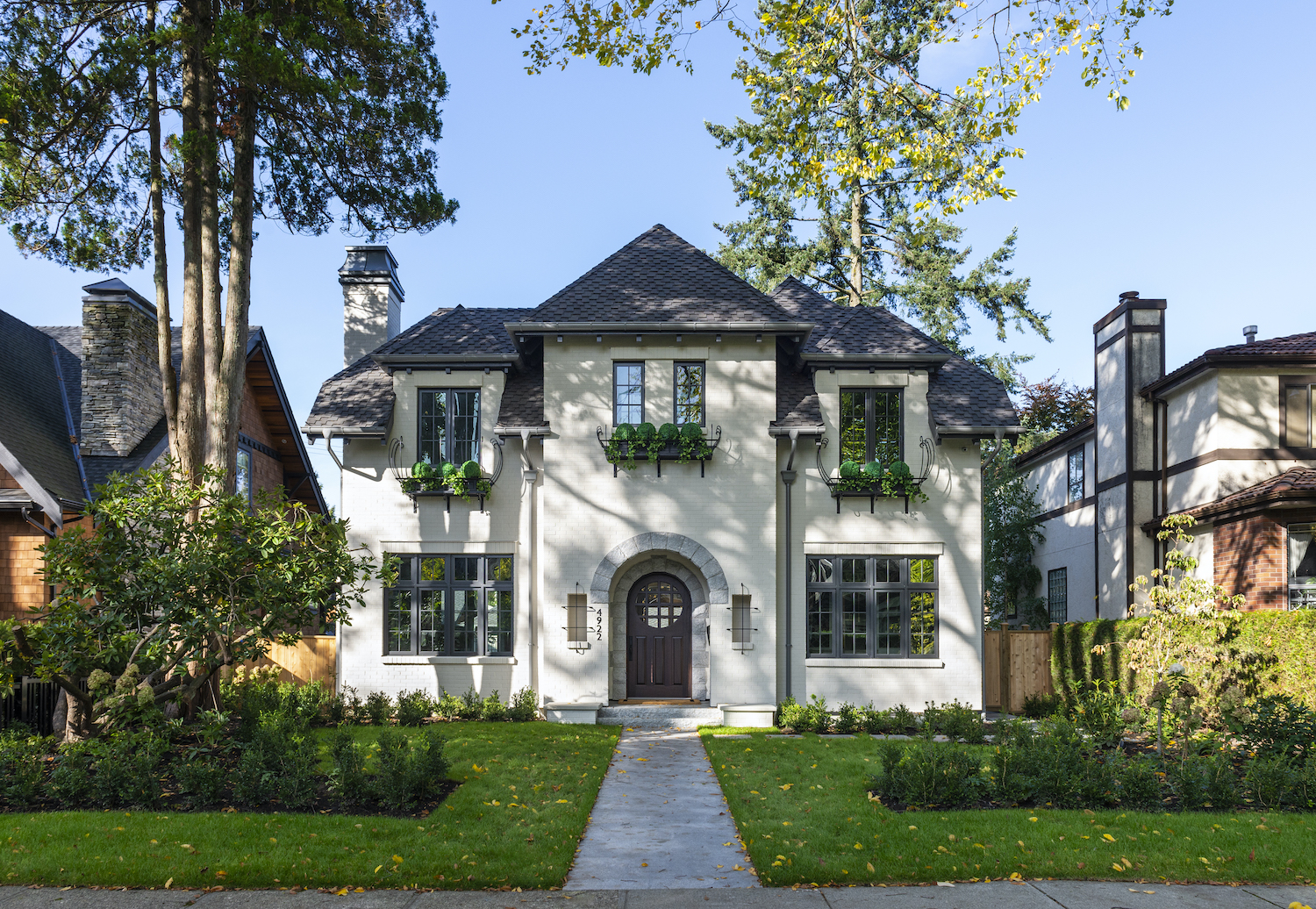 This French Maison clad in white bricks with wrought iron accents brings elegance to the established Shaughnessy neighborhood. Its balanced, symmetrical proportions, tall windows, hipped roof, and arched entry way add charm and careful editing to this stately residence.