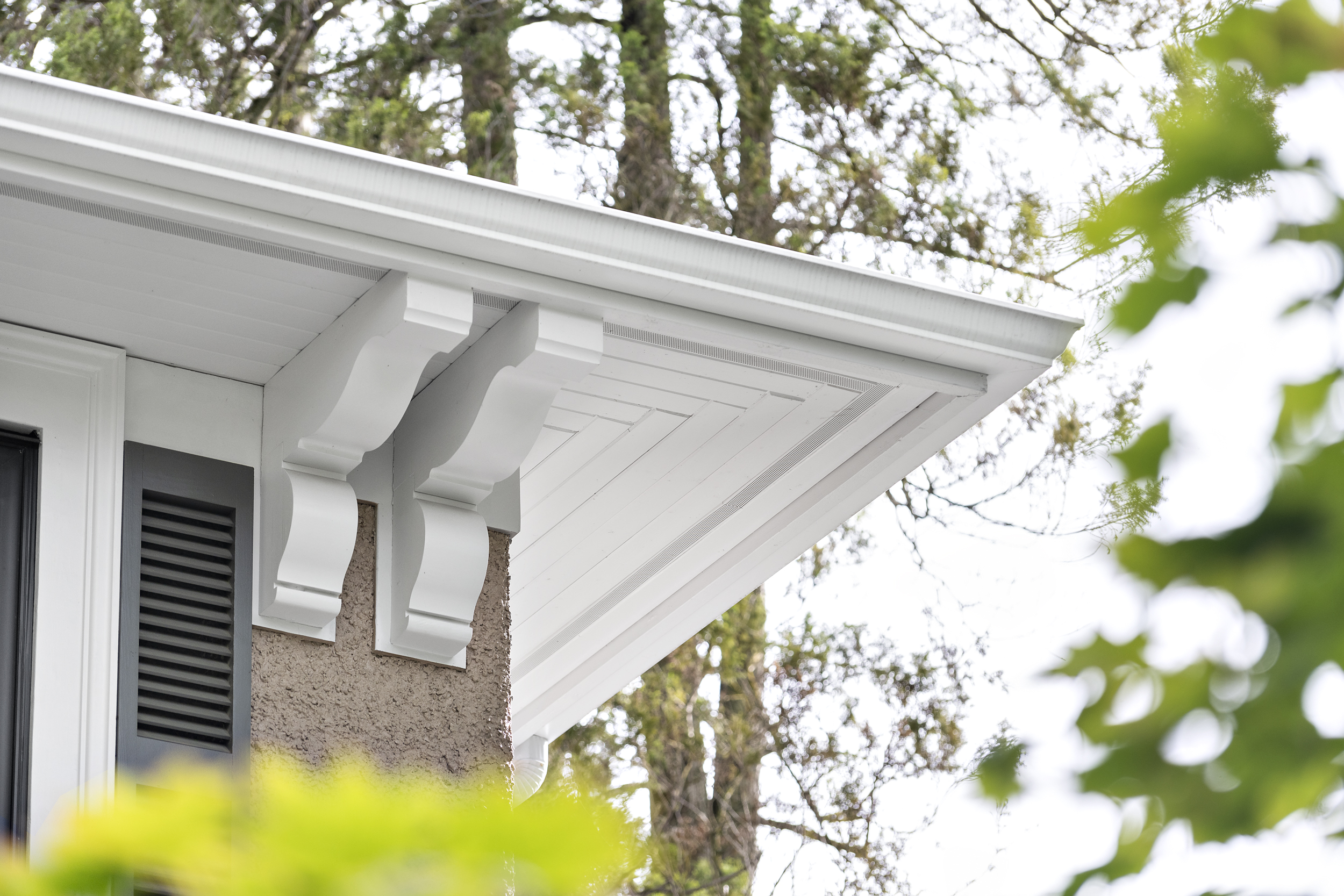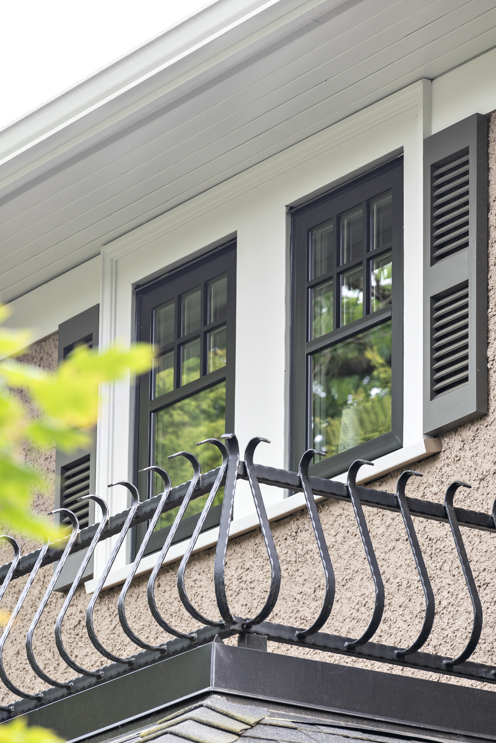 The existing exterior façade, roof form, wood sash windows with muntin bars, and stucco finish of the character home were retained. New construction was detailed and installed to match the original character house.