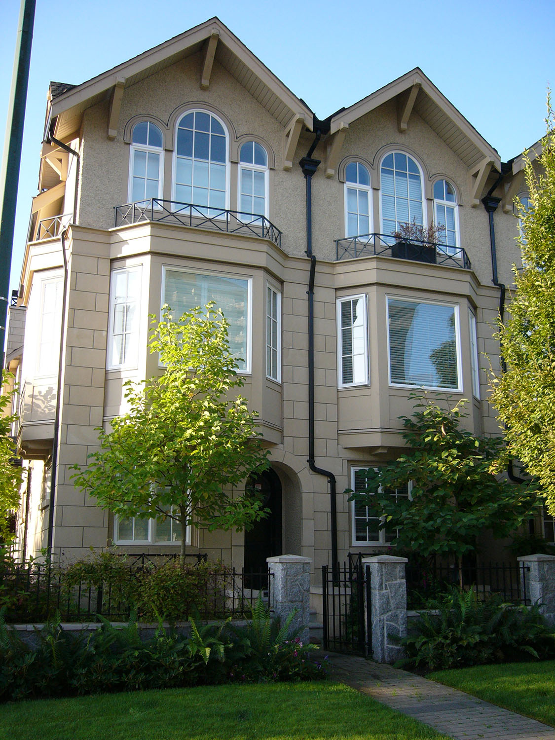 This collection of 24 townhomes in Fairview was designed to look like they were always there. The transition from stone to stucco of the siding, roof details like a catslide roof and a steep pitch, arched muntin windows, and ornamental chimney caps are just some of the many unique elements of Brownstone Townhomes found elsewhere in North America
