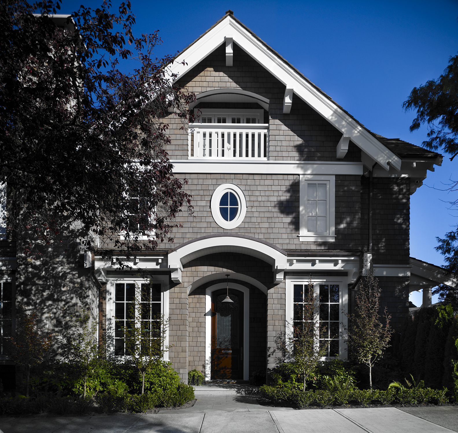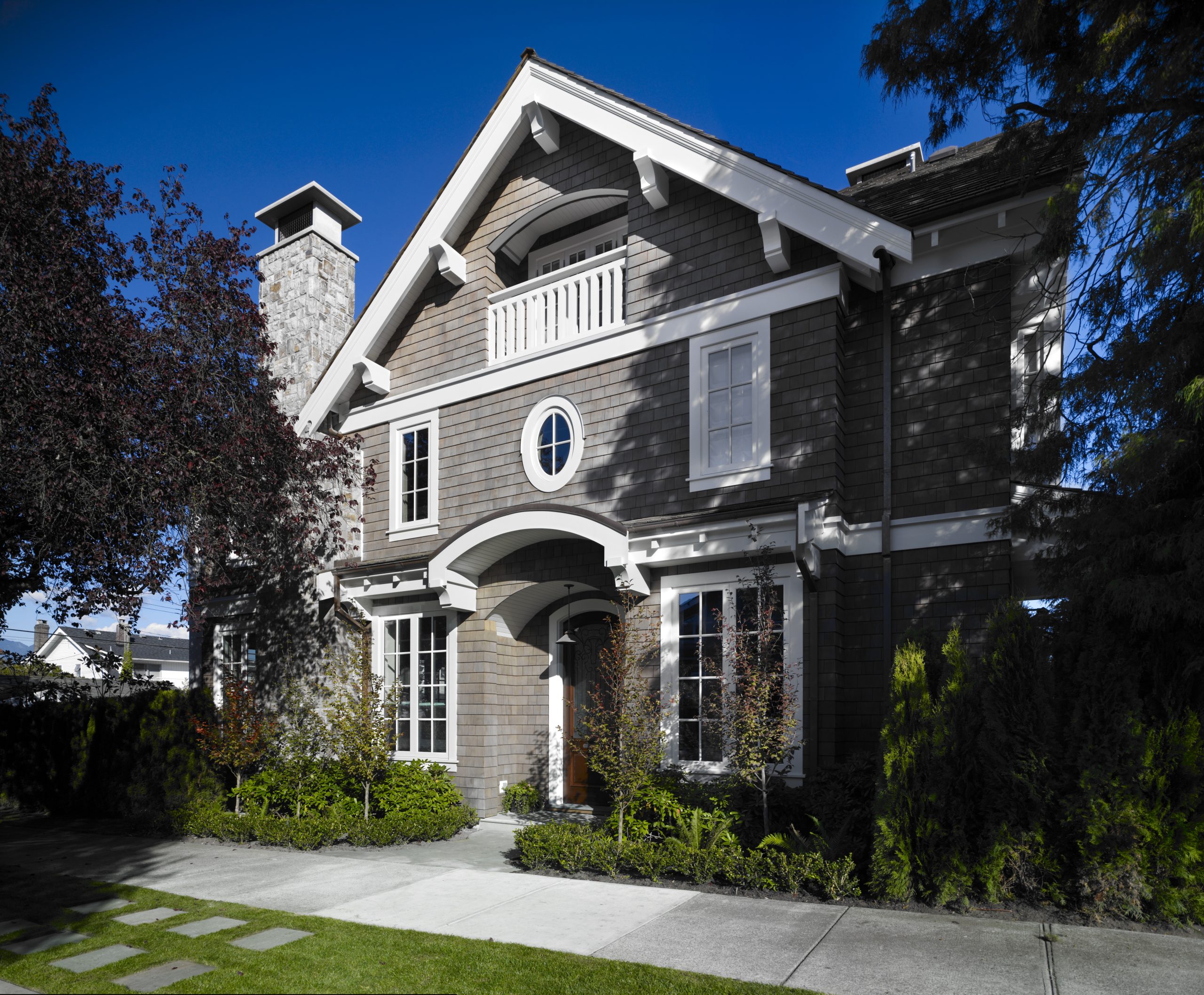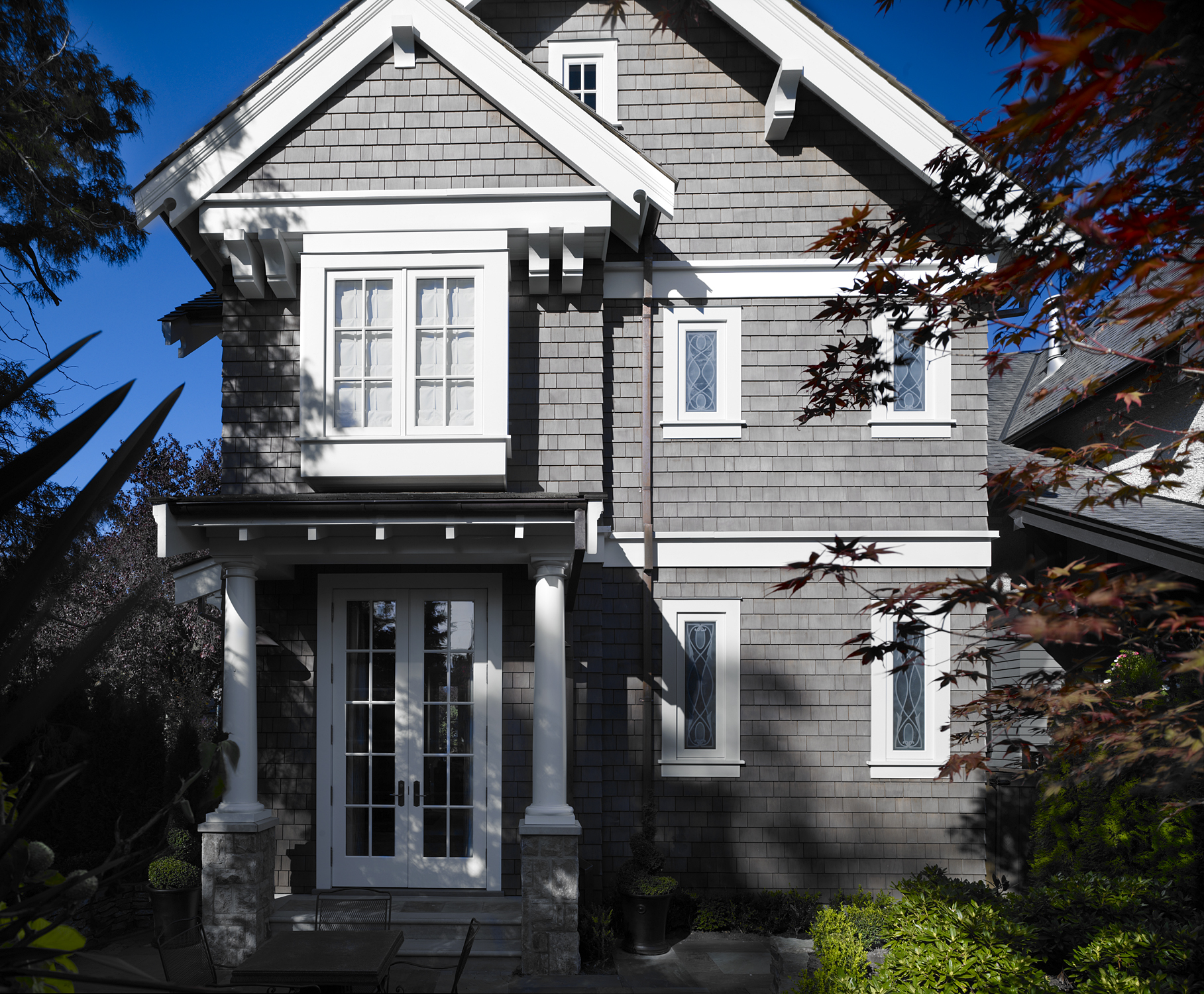 This residence in the Kitsilano neighborhood connects modern living with historical Edwardian elements like a steep gabled roof, symmetrical front façade, mid-range body colour with lighter trim, muntin windows, and stained-glass windows. The simplicity and elegance of clean lines on this shingle-sided exterior contain a dramatic three-level spiral staircase within.