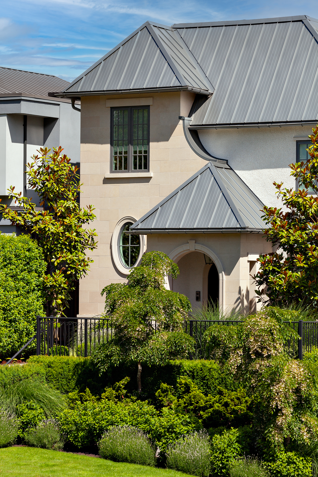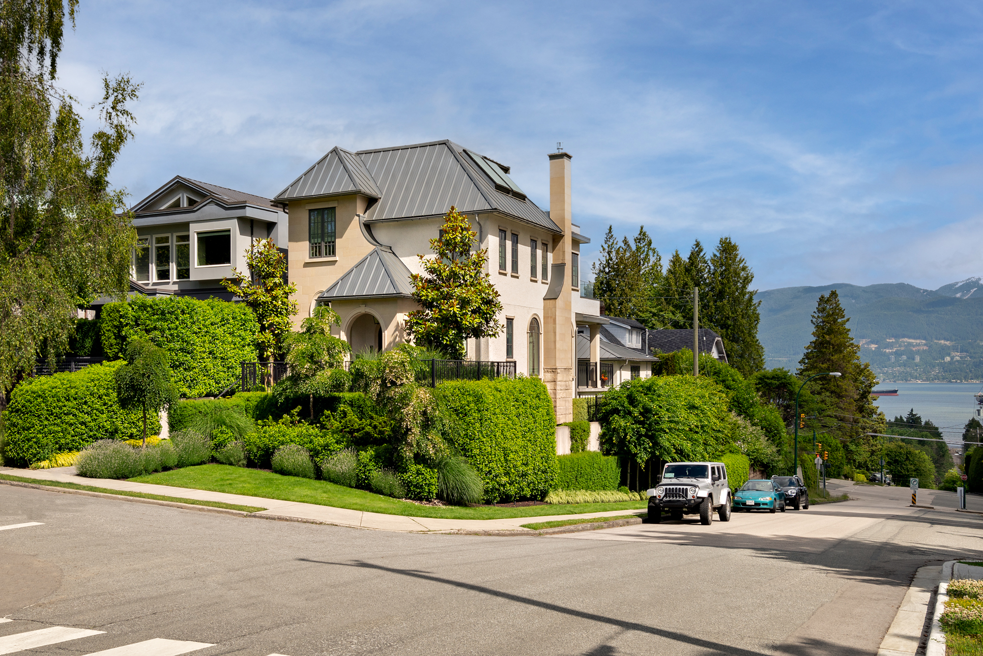 This urban villa in the heart of Point Grey features limestone detailing, arched window expressions, and sharp metal rooflines. The roof deck offers unimpeded views of English Bay and the North shore, while the restrained front entrance lends a welcoming embrace to the established Point Grey streetscape.
