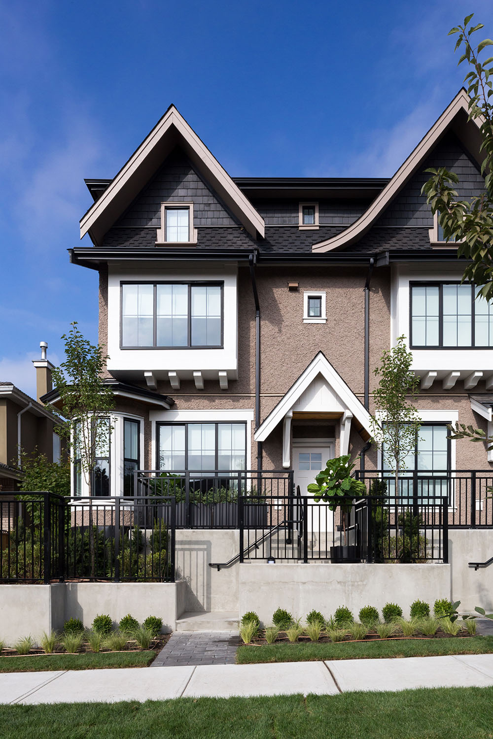 Formwerks adopted a contemporary traditional design with a catslide roofline and a steep pitch for this collection of 15 townhomes located in Marpole. The intricate wood detailing, decorative knee brackets and dentils bring an irreverent single-family charm to multi-family homes in a neighbourhood.