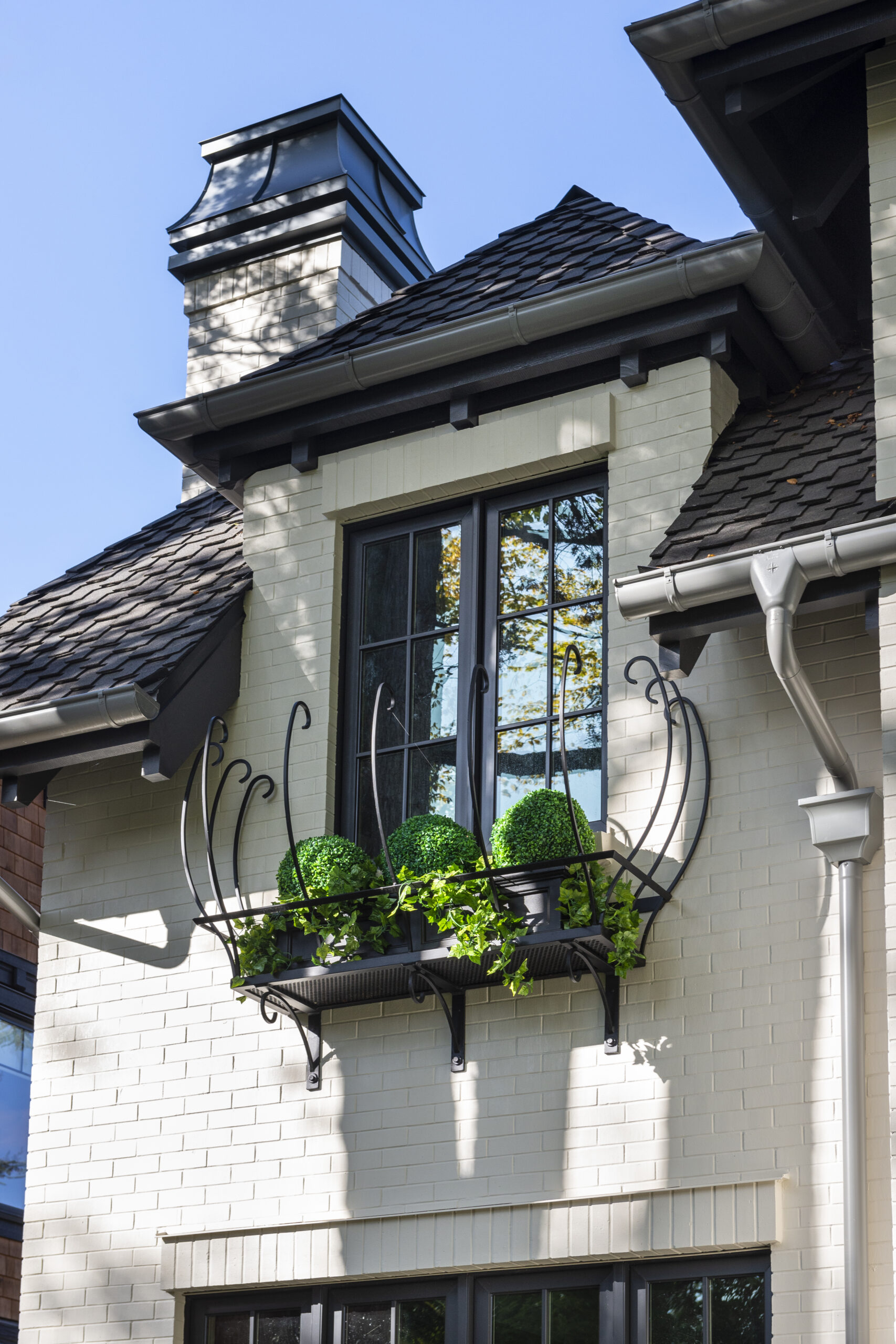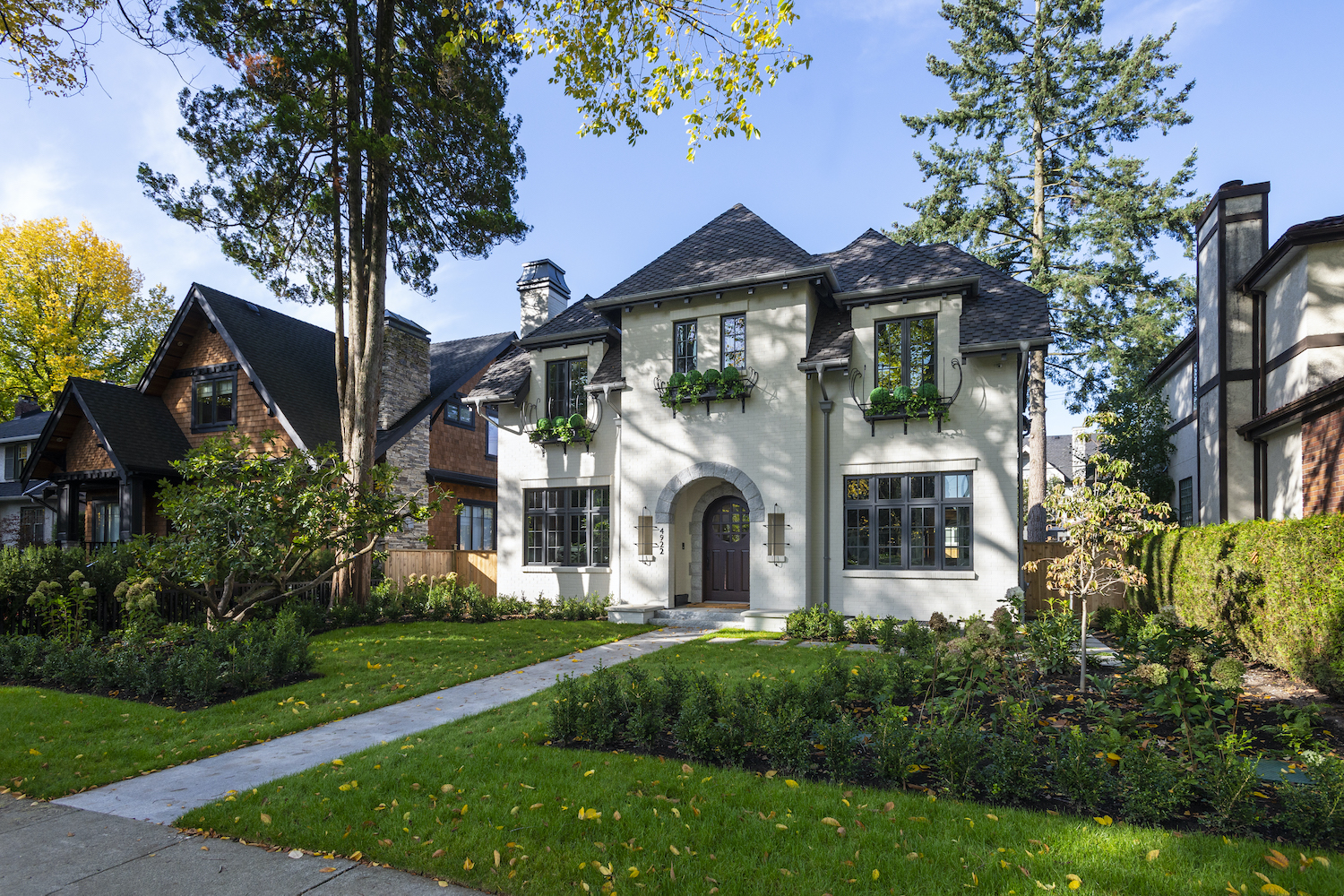 This French Maison clad in white bricks with wrought iron accents brings elegance to the established Shaughnessy neighborhood. Its balanced, symmetrical proportions, tall windows, hipped roof, and arched entry way add charm and careful editing to this stately residence.