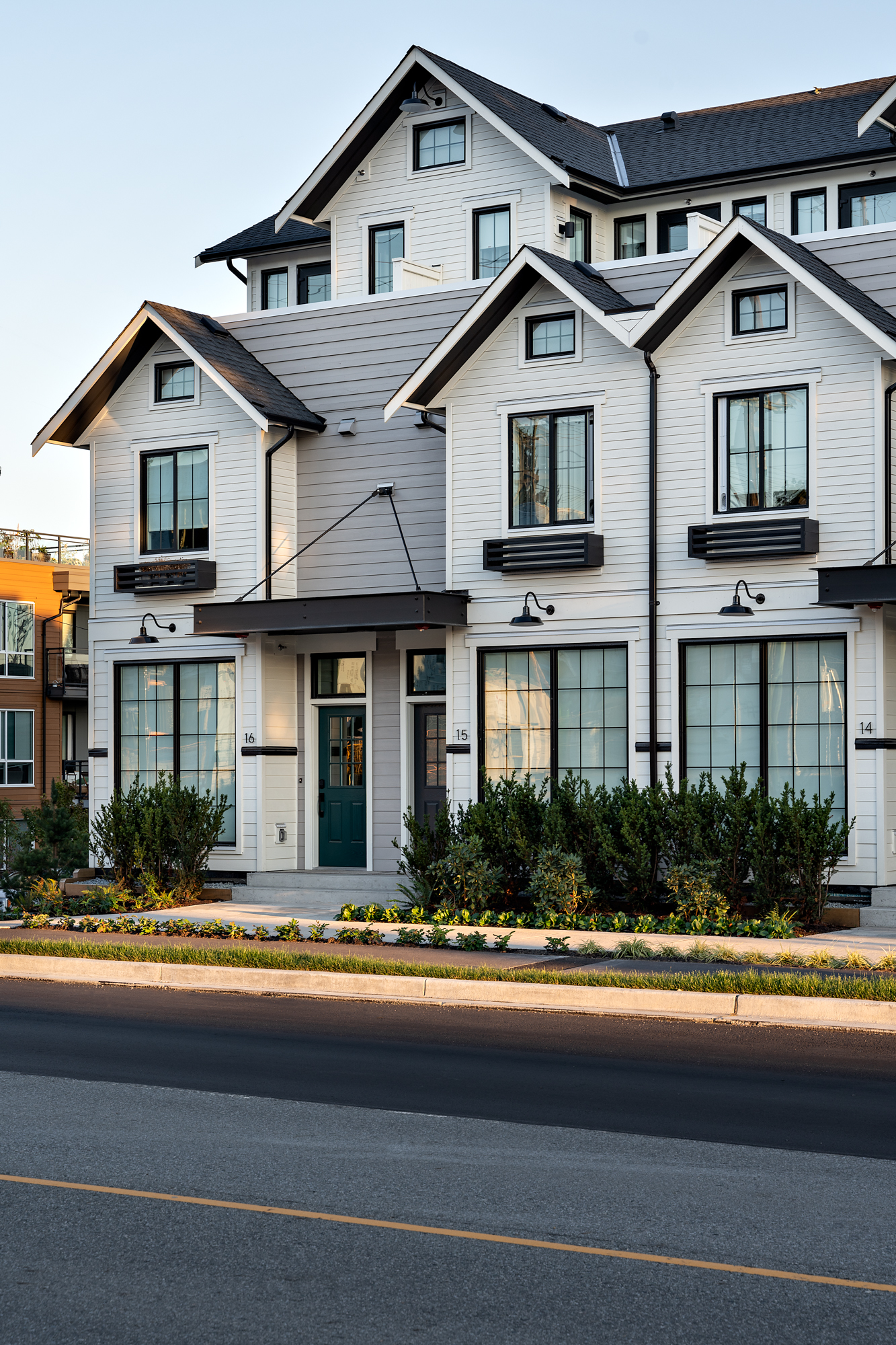 The contemporary architecture considers local traditional building styles and maintains a single-family expression. Proportionate windows are set symmetrically into traditional massing forms, which is stepped back at upper levels to allow additional natural light into the community courtyard.