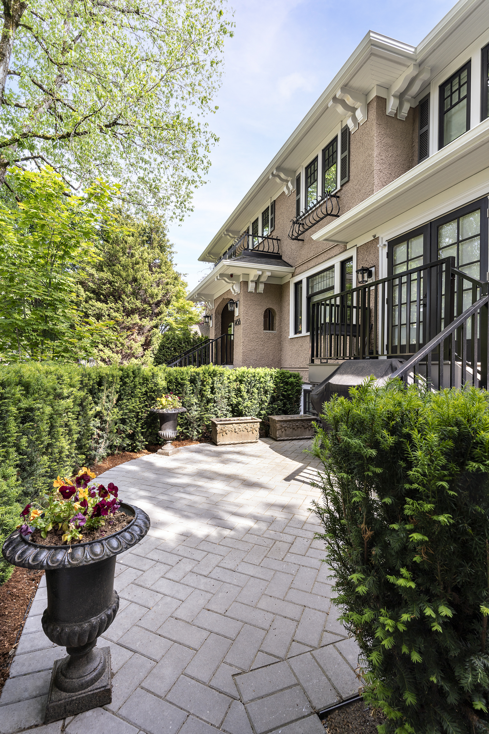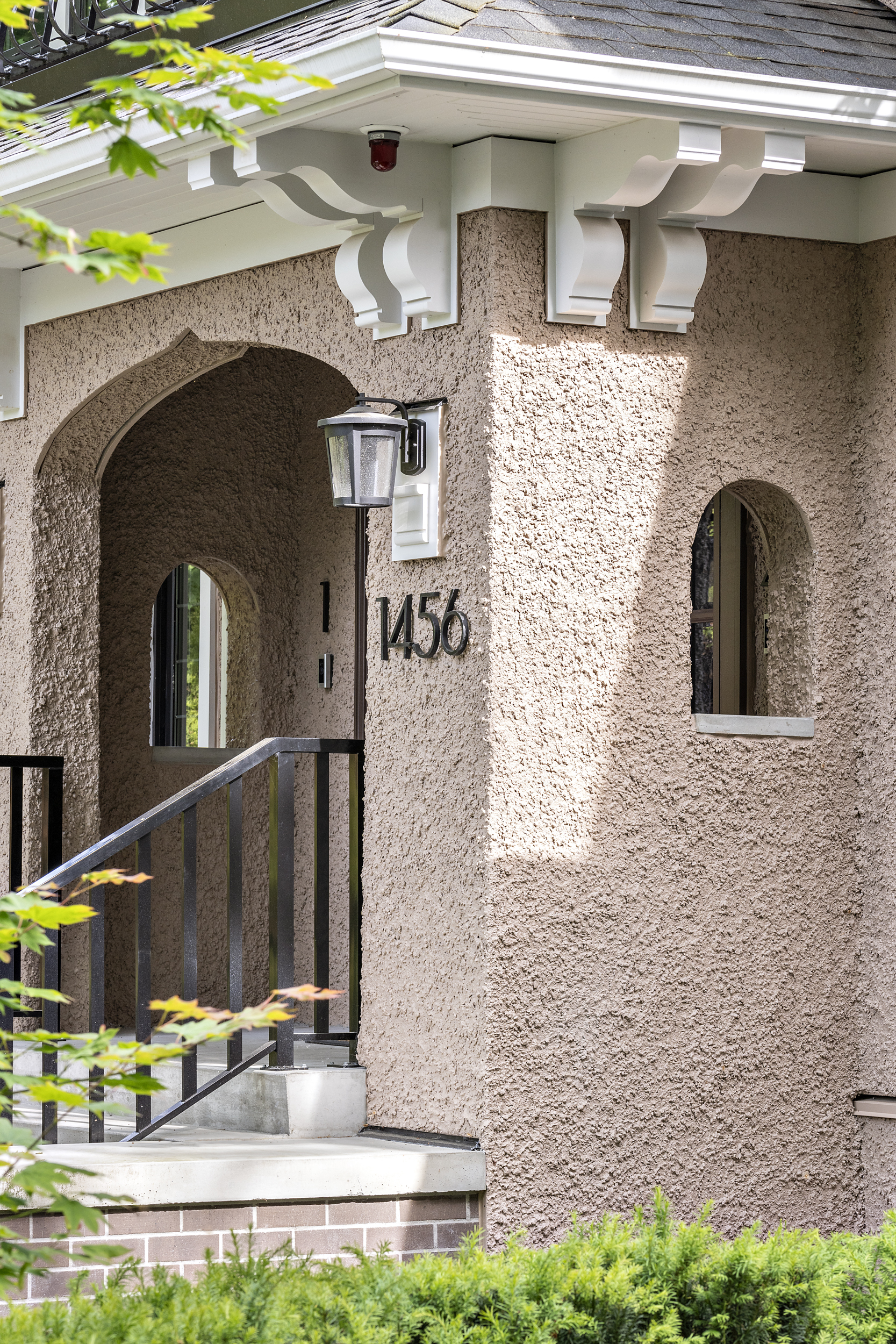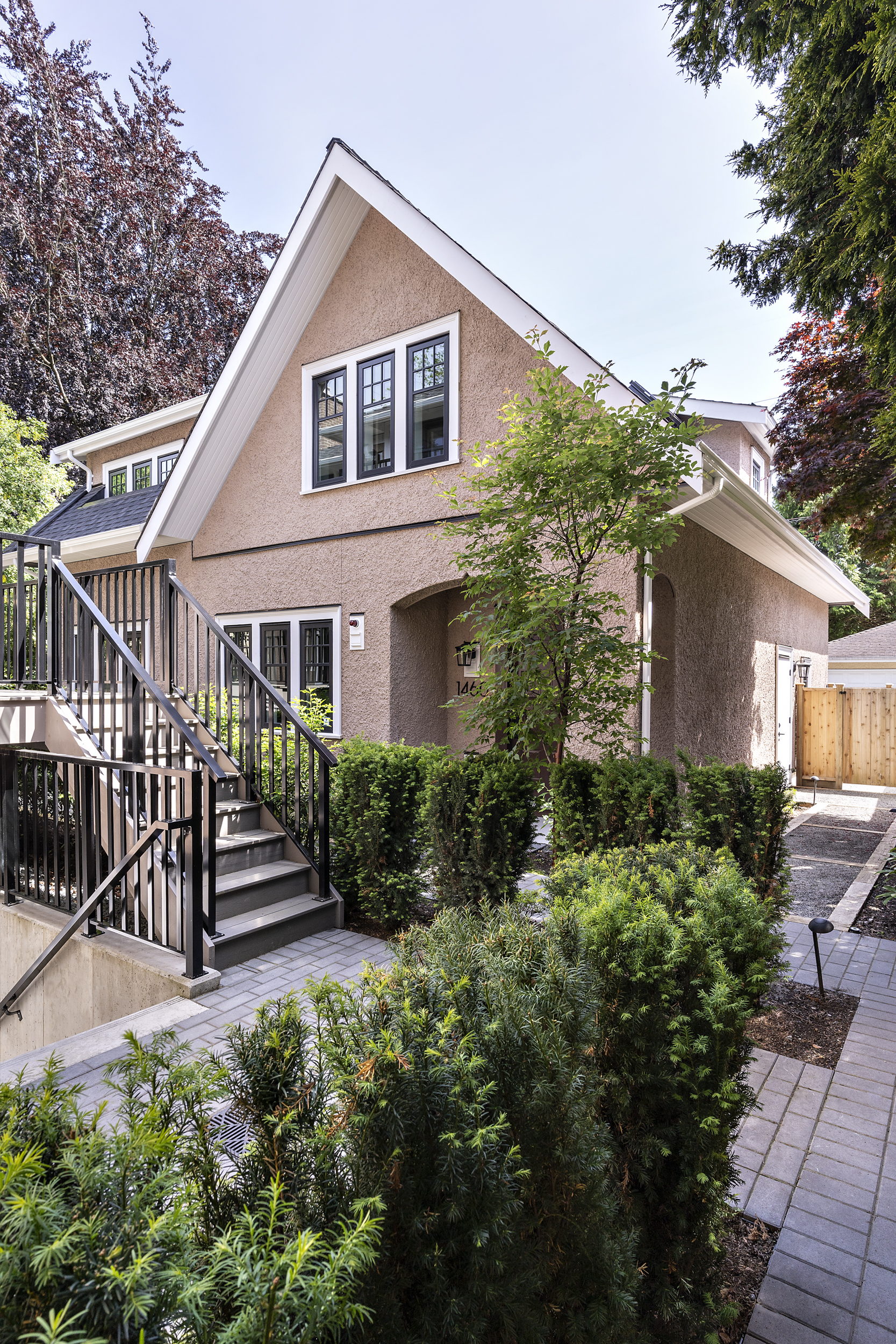 The existing exterior façade, roof form, wood sash windows with muntin bars, and stucco finish of the character home were retained. New construction was detailed and installed to match the original character house.
