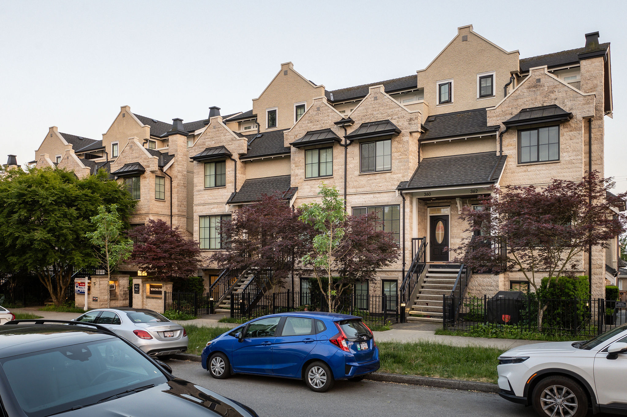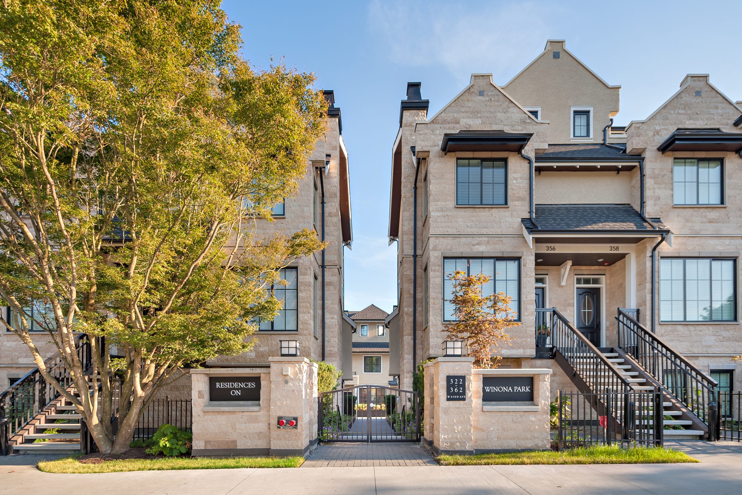 Inspired by the elegance of French Chateaus, the real stone façade, tall chimneys with decorative caps, Flemish gables and metal roof awnings make these homes a bold addition to the Marpole neighborhood.